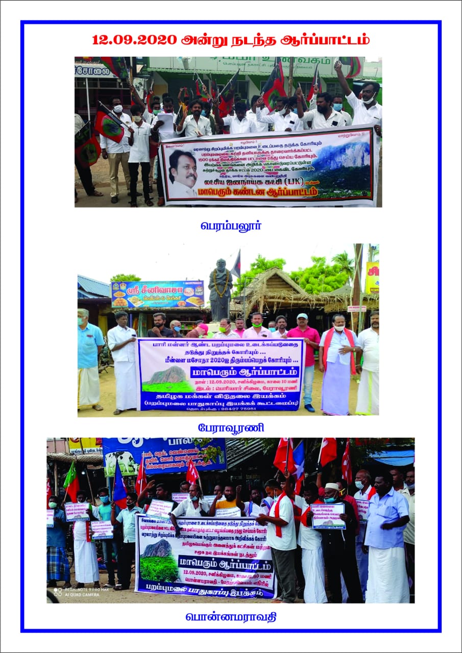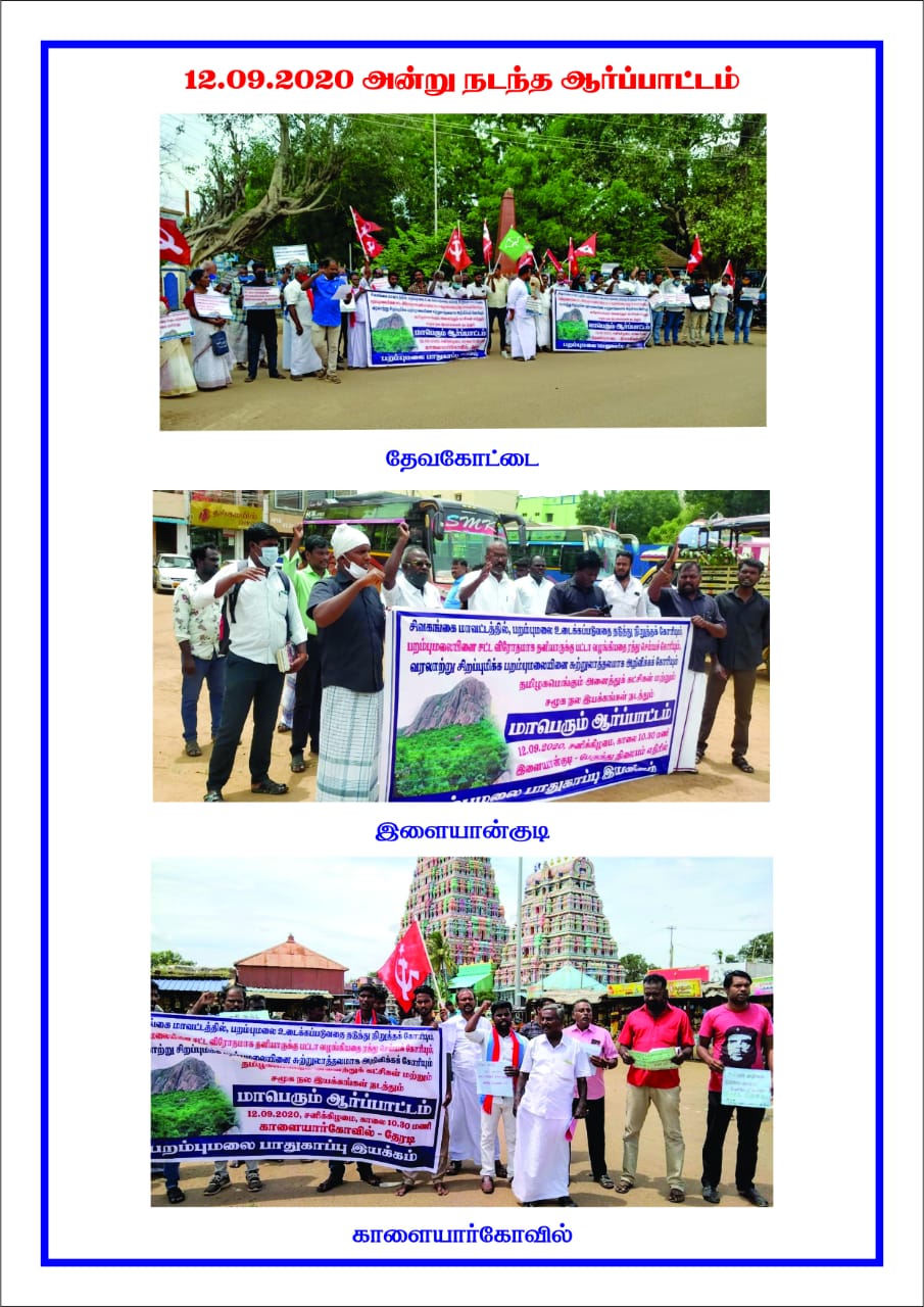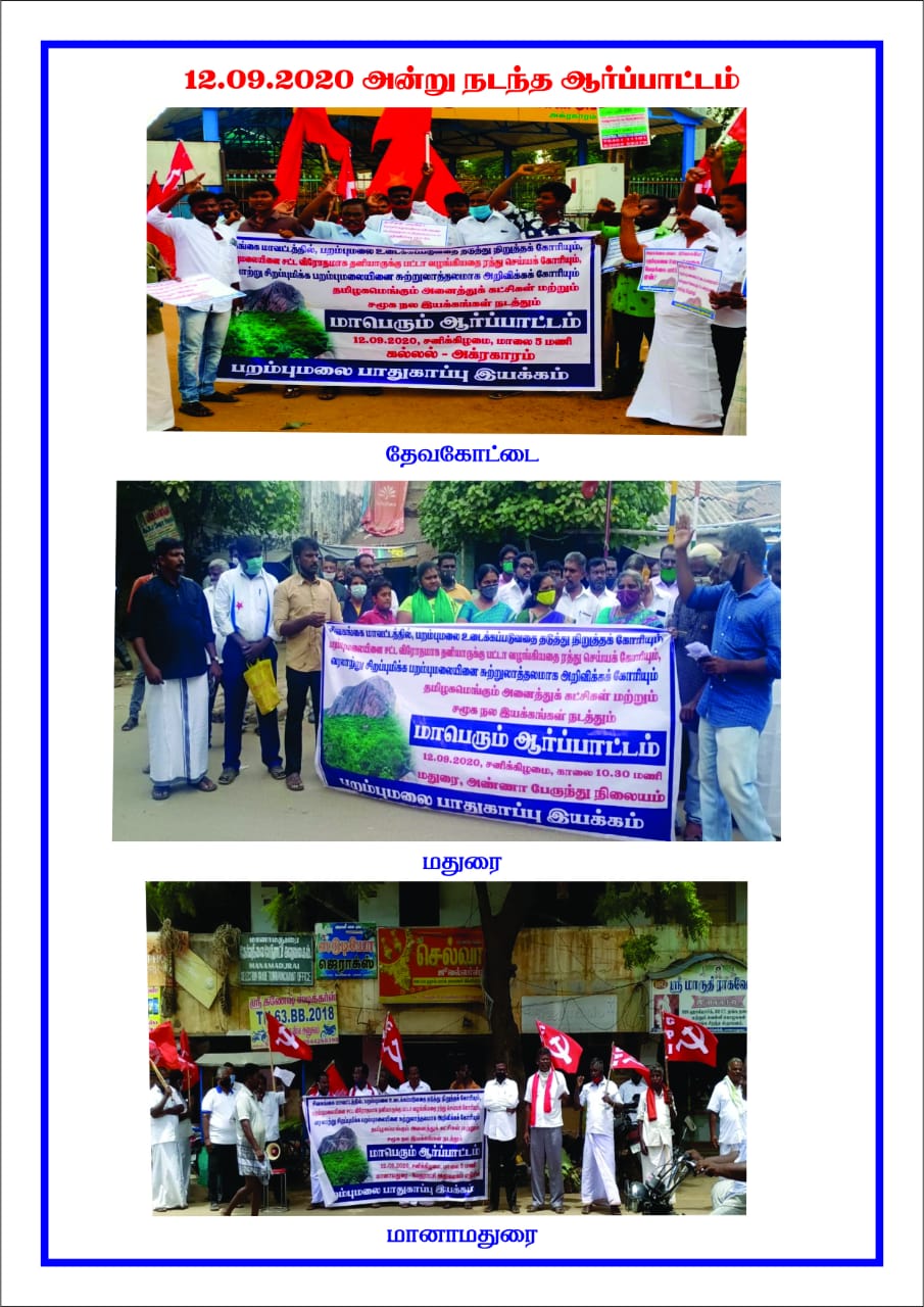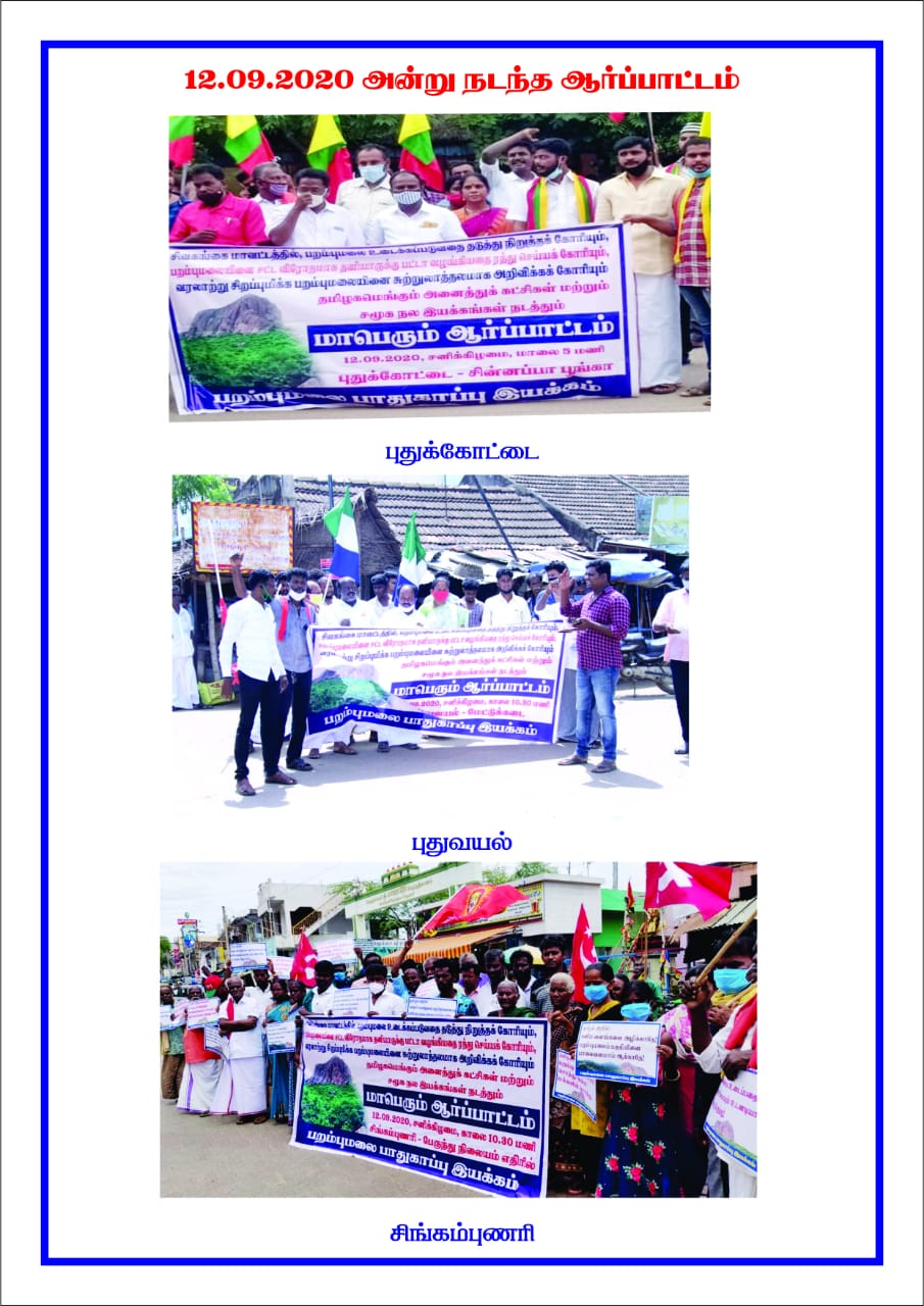 பாரிமன்னர் ஆண்ட பறம்பு மலைப்பகுதி உடைக்கப்படுவதை நிறுத்தக்கோரி தமிழ்நாடு முழுவதும் 17 இடங்களில் பறம்புமலை பாதுகாப்பு இயக்கத்தின் சார்பில் பல்வேறு இயக்கங்கள் ஒன்றுகூடி ஆர்ப்பாட்டங்கள் நடைபெற்றன.